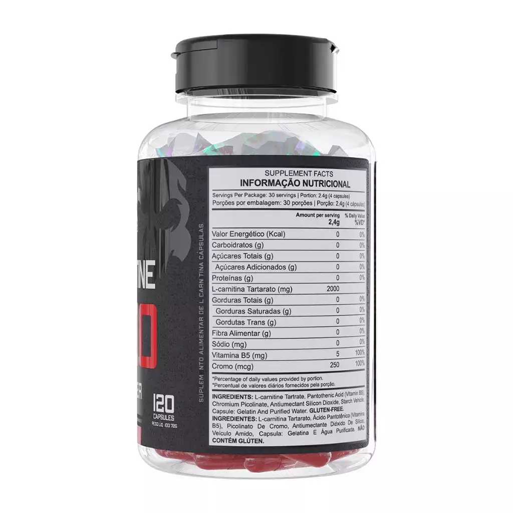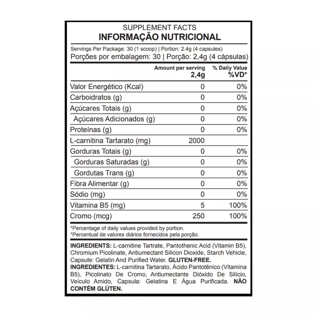 • L-carnitina Tartarato, Ácido Pantotênico (Vitamina B5), Picolinato de Cromo, Antiumectante Dióxido de Silício, Veículo Amido, Capsula: Gelatina e Água Purificada. NÃO CONTÉM GLÚTEN.